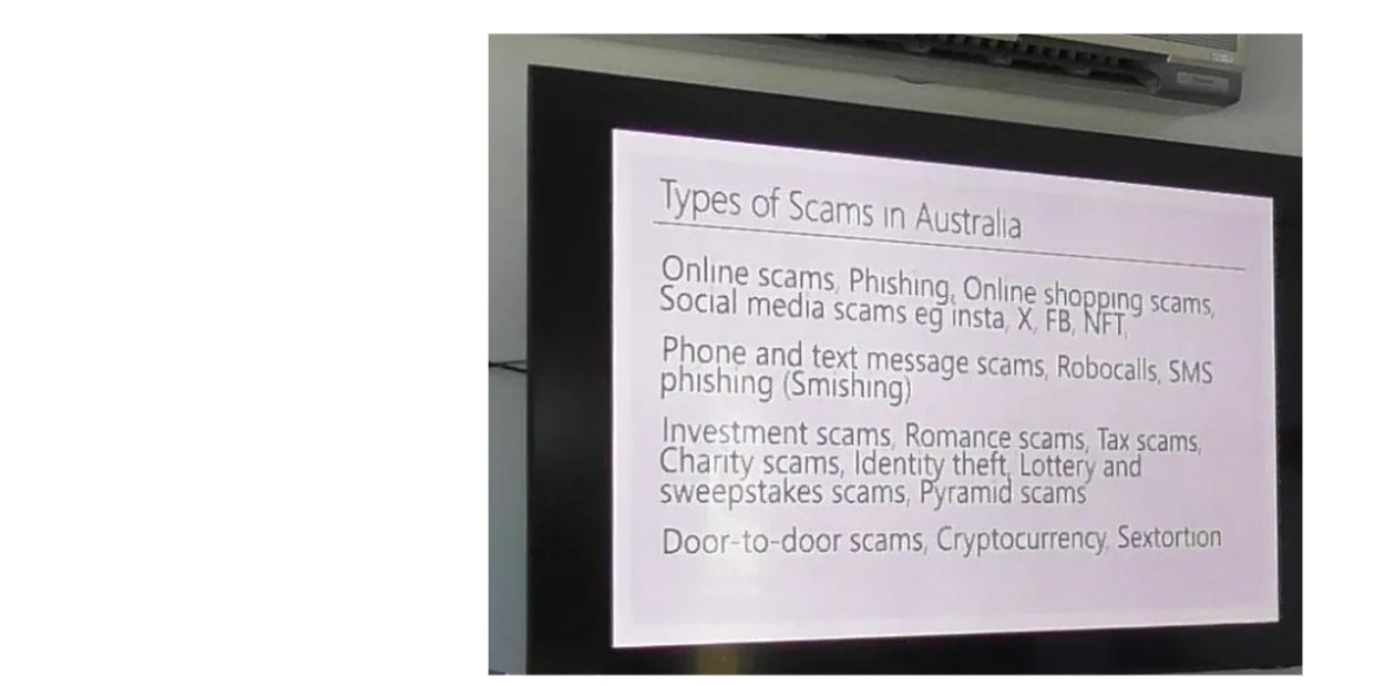 We can tailor a presentation for your community group. The presentations run for about 45 minutes and are interactive and include a visual presentation. Call 0421 173 193 or 0405 570 245 to further discuss The Australian Anti Scam Alliance presenting to your group.